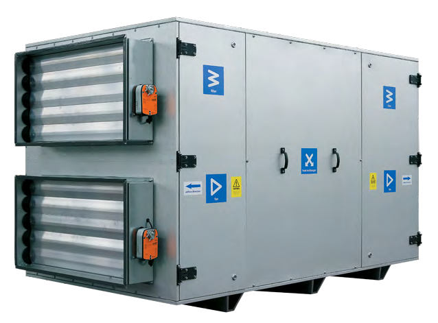 Centrala wentylacyjna z odzyskiem ciepła to nowoczesne urządzenie wentylacyjne zapewniające mechaniczną wymianę powietrza w pomieszczeniach z jednoczesnym jego filtrowaniem. Konstrukcja wymiennika płytowego umożliwia pozyskanie energii cieplnej z powietrza wywiewnego do ogrzania powietrza nawiewanego z zewnątrz. Centrale są przeznaczone do energooszczędnej wentylacji obiektów oraz montażu z przewodami wentylacyjnym o przekroju 600x350, 700x400 oraz 1000x500 mm.