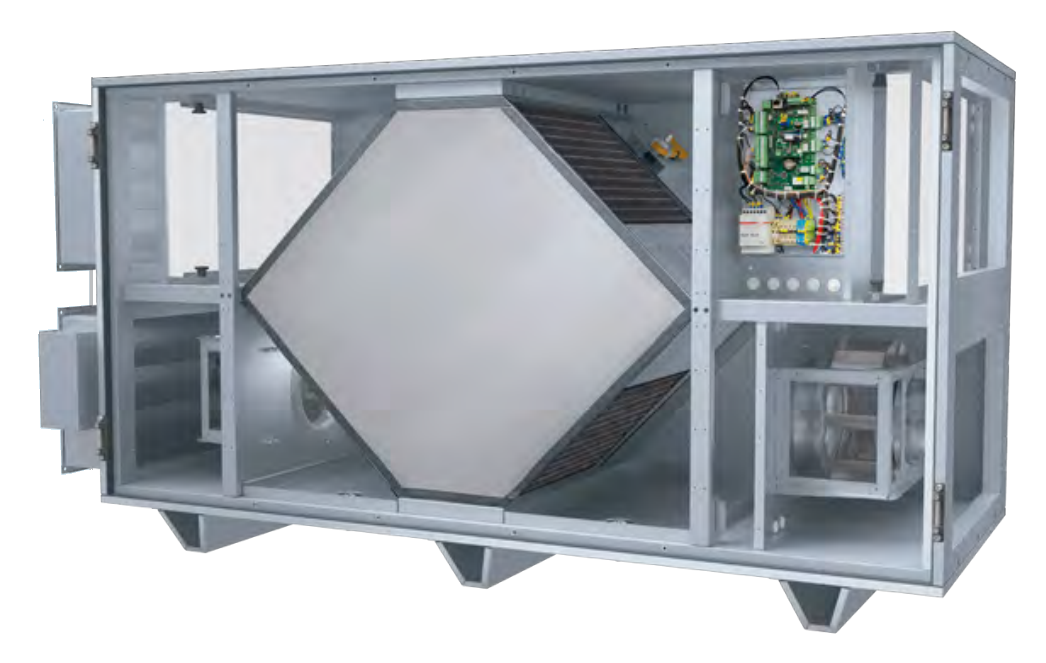 Centrala wentylacyjna z odzyskiem ciepła to nowoczesne urządzenie wentylacyjne zapewniające mechaniczną wymianę powietrza w pomieszczeniach z jednoczesnym jego filtrowaniem. Konstrukcja wymiennika płytowego umożliwia pozyskanie energii cieplnej z powietrza wywiewnego do ogrzania powietrza nawiewanego z zewnątrz. Centrale są przeznaczone do energooszczędnej wentylacji obiektów oraz montażu z przewodami wentylacyjnym o przekroju 600x350, 700x400 oraz 1000x500 mm.