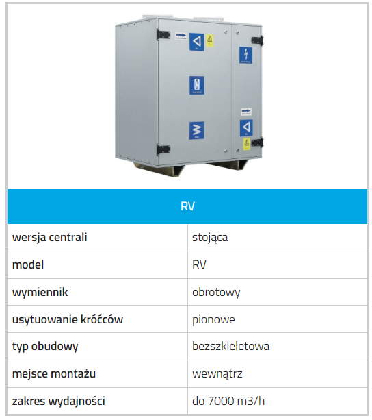Centrale RV są wyposażone w obrotowy wymiennik ciepła zbudowany z walca wypełnionego falistą taśma aluminiową rozmieszczoną w taki sposób, aby strumienie powietrza nawiewanego i wywiewanego przechodząc przez wymiennik nie wchodziły ze sobą w bezpośredni kontakt. Podczas rotacji przez wnętrze wymiennika przechodzi najpierw nawiewane, a potem zużyte powietrze z pomieszczeń. W wyniku tego procesu dochodzi do przekazania ciepła i wilgoci zużytego powietrza strumieniowi napływającemu z zewnątrz. Zaletą wymiennika rotacyjnego w porównaniu z płytowym jest wyższa efektywność, odzysk wilgoci oraz bardzo niskie ryzyko zamarznięcia. W centralach z wymiennikiem obrotowym nie ma konieczności oprowadzania skroplin.