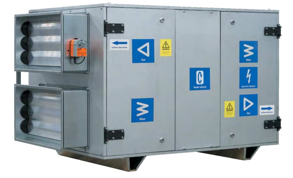Centrala wentylacyjna z wymiennikiem obrotowym, stojąca z króćcami na boki, strona lewa, silniki EC, automatyka A31