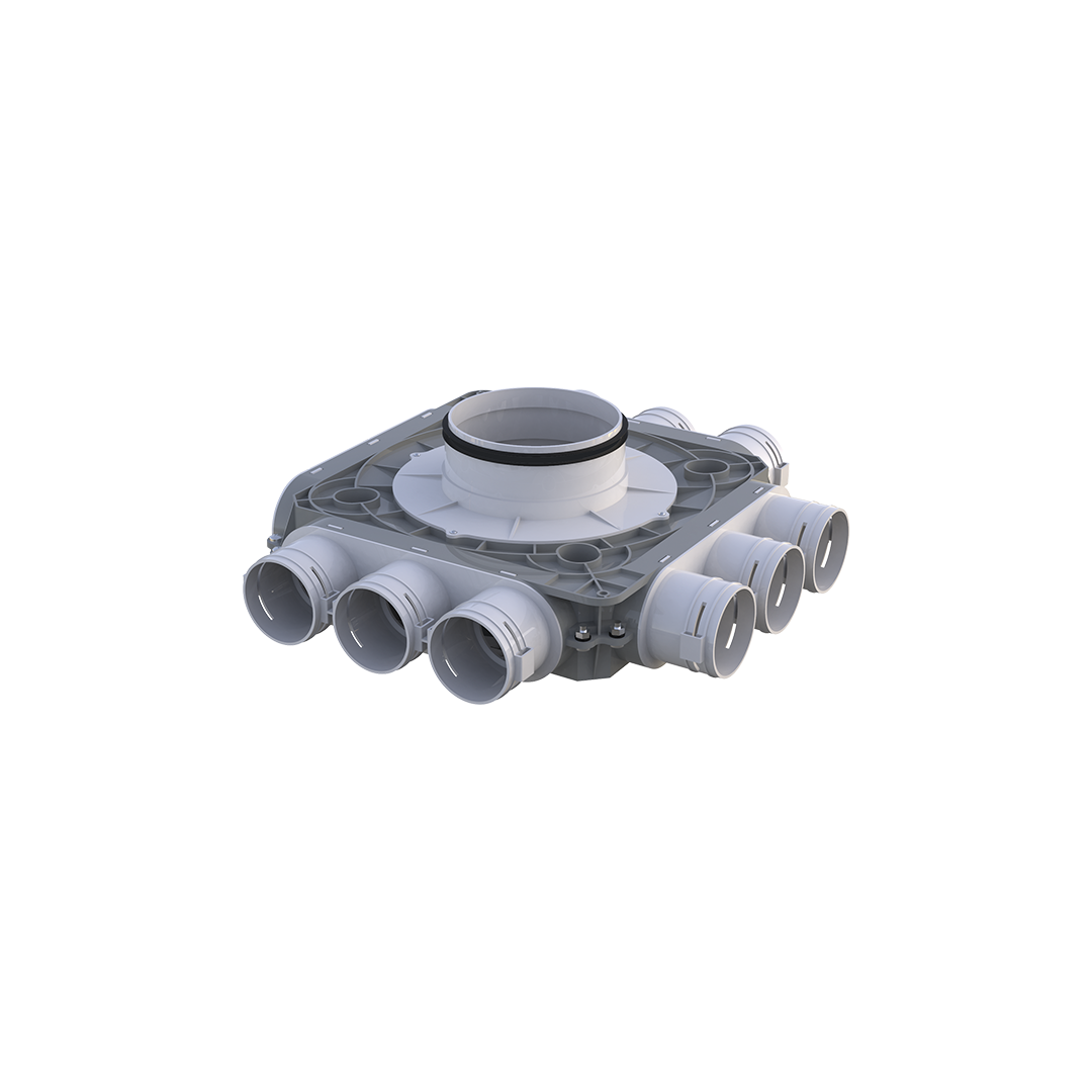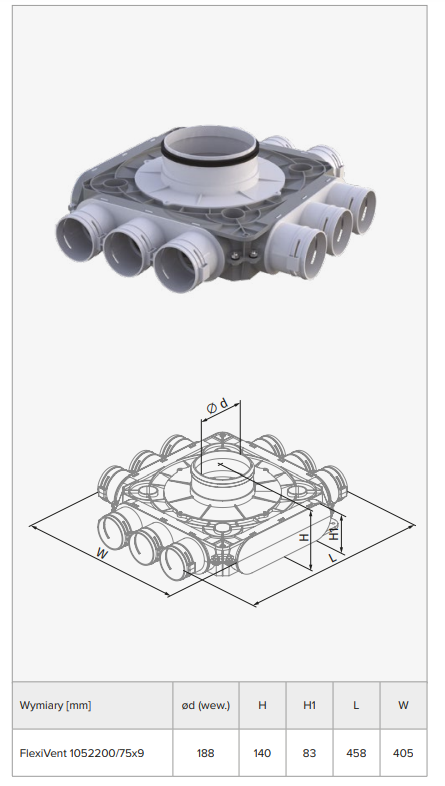 Rozprowadzenie powietrza do kanałów elastycznych Ø75 mm w systemach wentylacji nawiewnej i wywiewnej pomieszczeń.