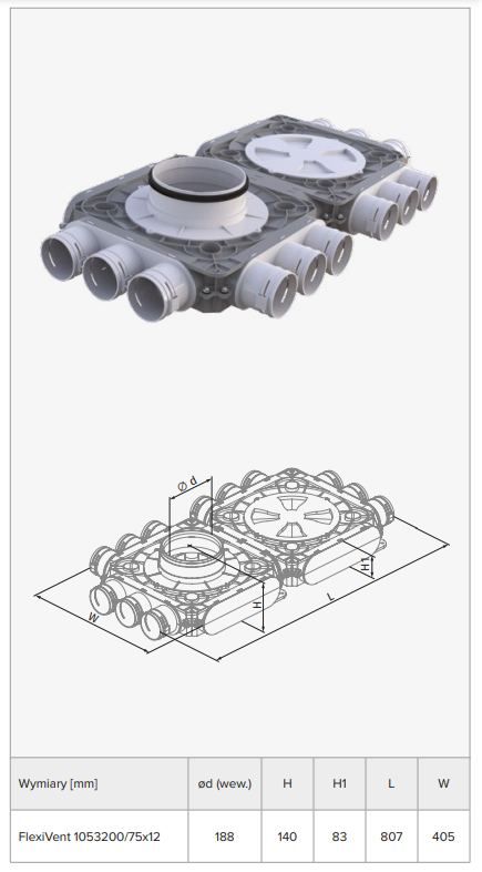 FLEXIVENT1053200/75X12 - Rozdzielacz podwójny 12-króćcowy, przyłącza DN75 potrójne, 12x75/200 mm