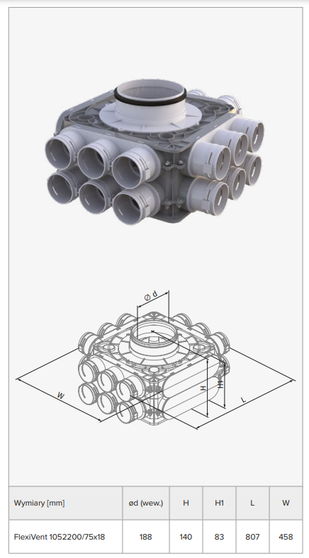 Rozprowadzenie powietrza do kanałów elastycznych Ø75 mm w systemach wentylacji nawiewnej i wywiewnej pomieszczeń.