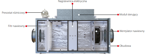 Nagrzewnica elektryczna zapewnia podgrzewanie powietrza nawiewanego w okresie zimowym.