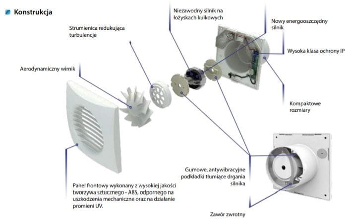 - Wentylator został wyposażony w specjalnie zaprojektowany zawór zwrotny zapobiegający cofaniu się powietrza do wnętrza pomieszczenia.
