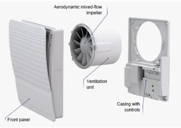 - Wentylator został wyposażony w siłownik termiczny, który umożliwia płynne otwieranie i zamykanie panelu przedniego zapobiegające cofaniu się powietrza do wnętrza pomieszczenia.