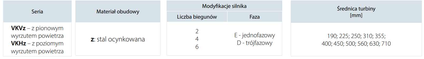 Cechy charakterystyczne: • silnik z zewnętrznym wirnikiem • poziomy wyrzut powietrza • rodzaj silnika: jedno (E)/ trójfazowe (D) |