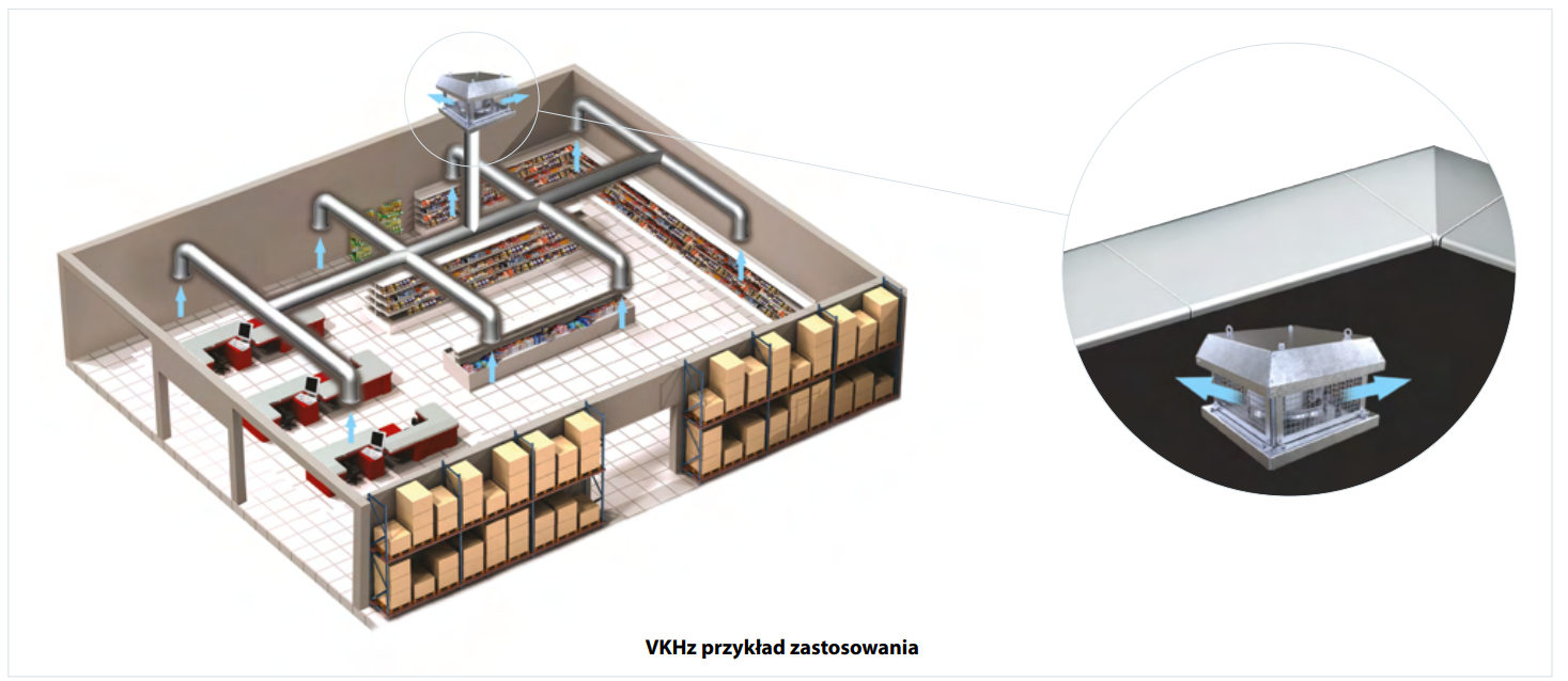 Wentylatory dachowe VKVz i VKHz mają zastosowanie w instalacjach wywiewnych różnego typu pomieszczeń. Wentylatory przystosowane są do montażu na podstawach dachowych izolowanych oraz tłumiących. Średnica lub przekrój kanałów wentylacyjnych uzależniona od wielkości i typu wentylatora.