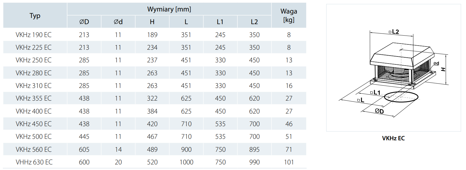 Wentylatory dachowe serii VKVz EC i VKHz EC wykorzystywane są w wywiewnej wentylacji pomieszczeń wymagających energooszczędnych rozwiązań, przy zachowaniu efektywnej wymiany powietrza. Zastosowanie silników EC redukuje zużycie energii o 35% przy jednoczesnym utrzymaniu wysokiego poziomu wydajności i niskiego poziomu hałasu. Zalecane do instalacji w obiektach użytku publicznego takich jak banki, supermarkety, sklepy, restauracje. Wentylatory przeznaczone są do montażu na podstawach dachowych lub tłumiących.