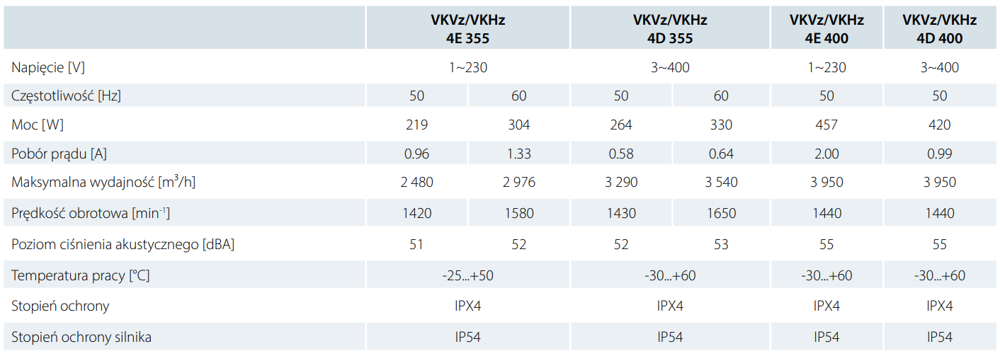 Cechy charakterystyczne: • silnik z zewnętrznym wirnikiem • poziomy wyrzut powietrza • rodzaj silnika: jedno (E)/ trójfazowe (D) |