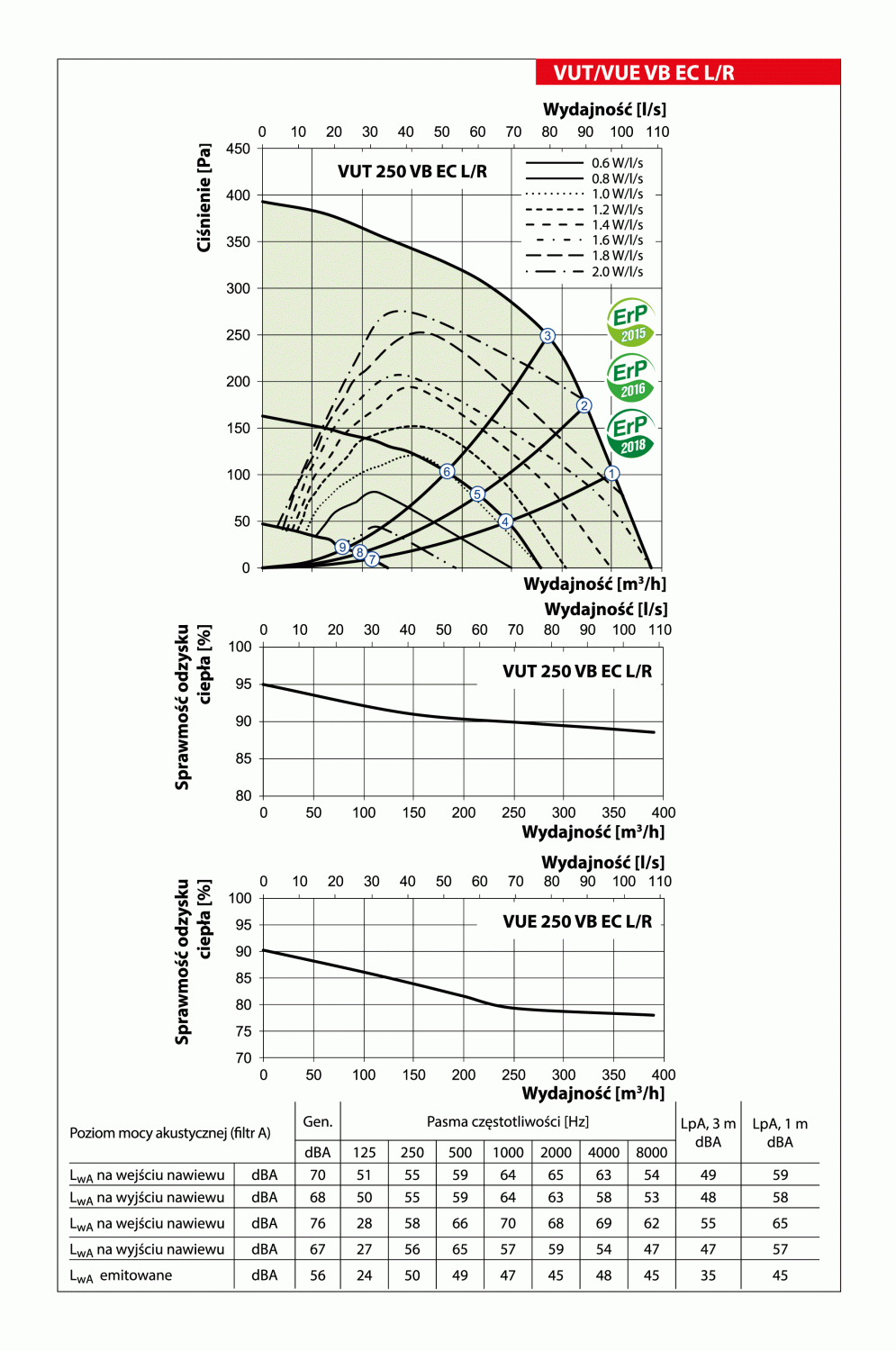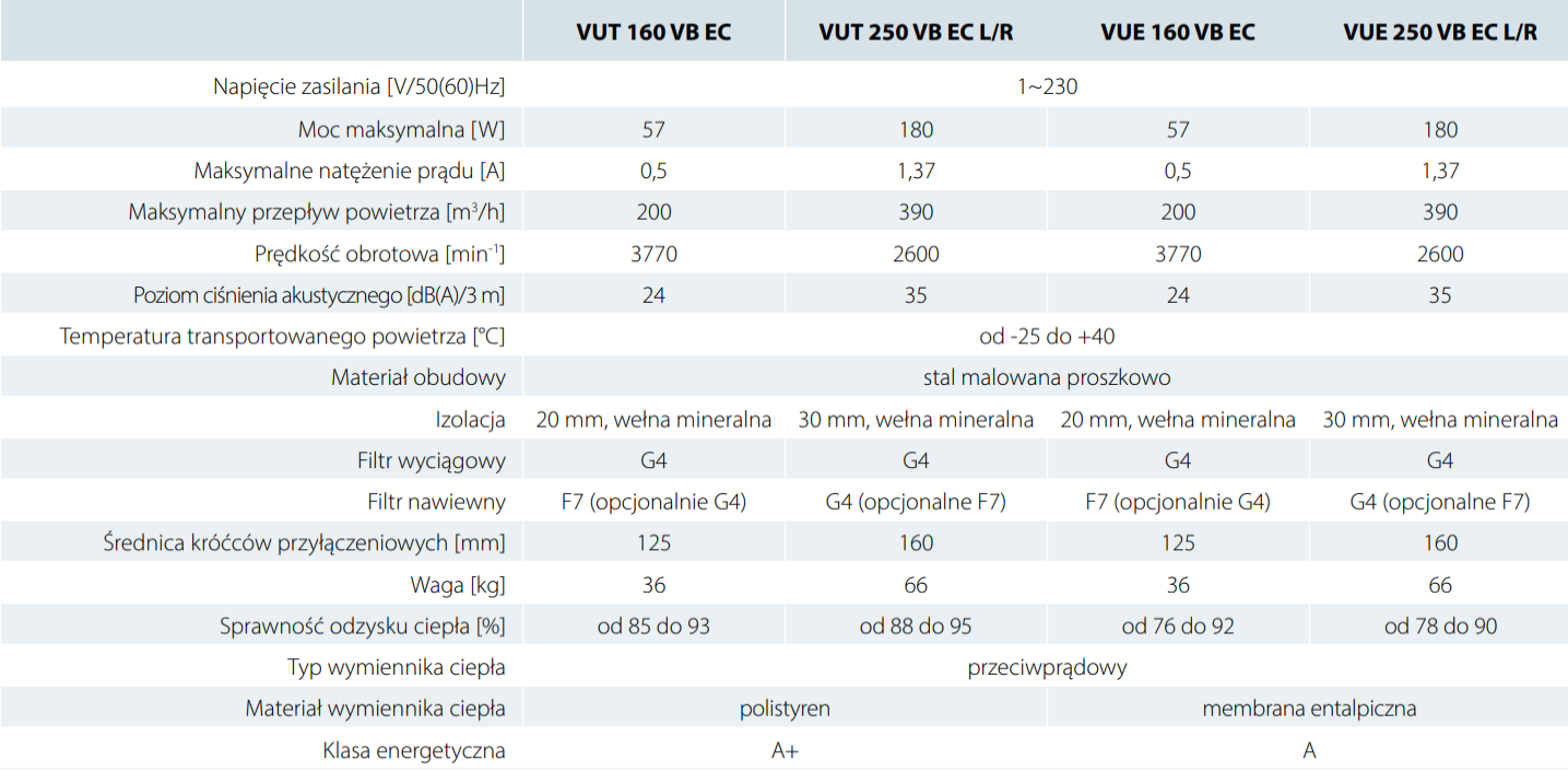 Centrale są wyposażone w filtry panelowe klasy F7 i G4 do filtracji powietrza nawiewanego i wywiewanego. Centrale VUT/VUE 250 VB EC są wyposażone w filtry klasy G4 do filtracji powietrza nawiewanego oraz wywiewanego. Filtr F7 jest dostępny jako opcja do filtracji powietrza nawiewanego.