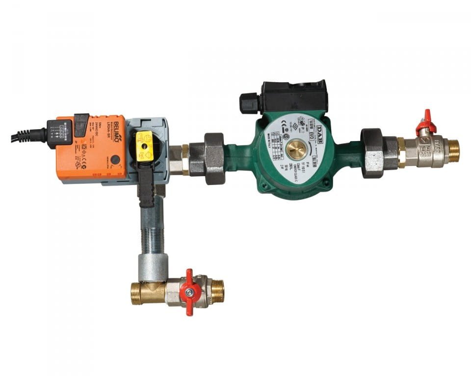 - zawór trójdrogowy z pompą wodną do zasilania nagrzewnic wodnych i aparatów grzewczych w wodę